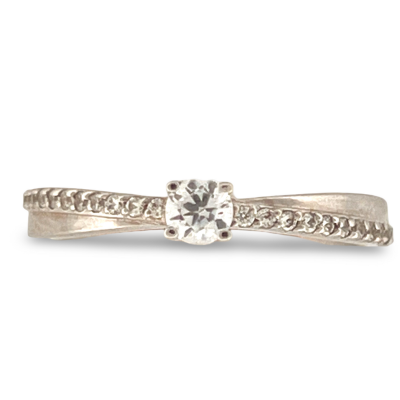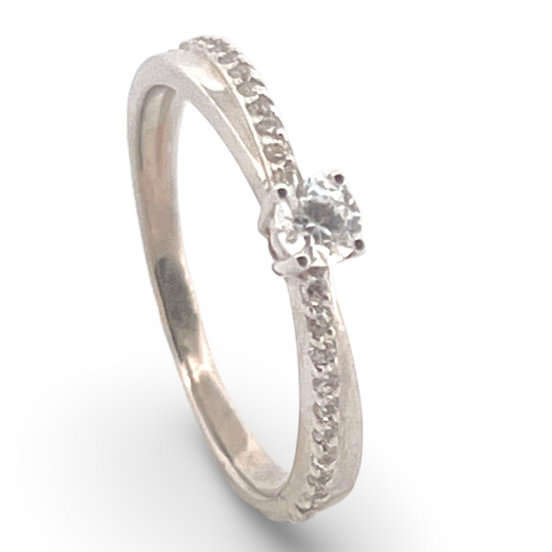 19K white gold solitaire with a central zirconia and side stones. A noble and delicate design that blends the modern shine of white gold with the timeless elegance of classic jewelry.