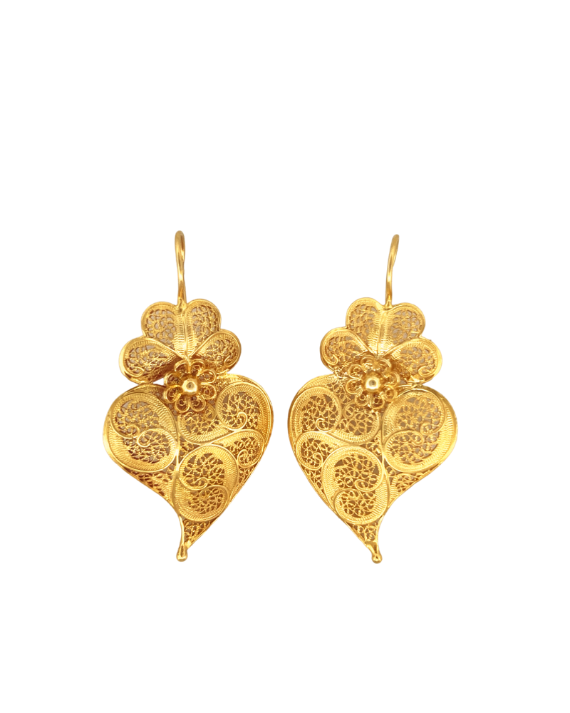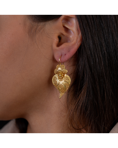 Flaming Heart Filigree Earrings in 925 gold plated silver filigree, 100% handmade and made in Portugal