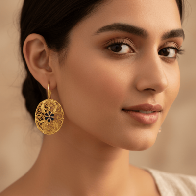 15 mm oval earrings featuring a delicate blue flower and handcrafted filigree in 19K yellow gold. Tradition meets modern charm.