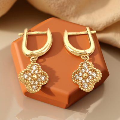 18K yellow gold earrings with zirconia-studded clover and clic clac closure. A delicate touch of elegance and luck.