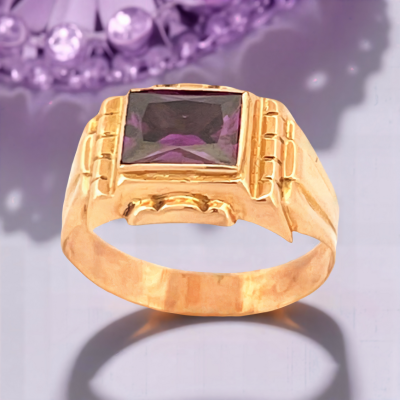 The Prism Ring stands out with its refined 19K yellow gold finish, featuring a solid band and beautifully crafted details around the central stone — a faceted rectangular purple gem that adds depth and refined brilliance. The goldwork embraces the stone with precision, creating a timeless and commanding piece.