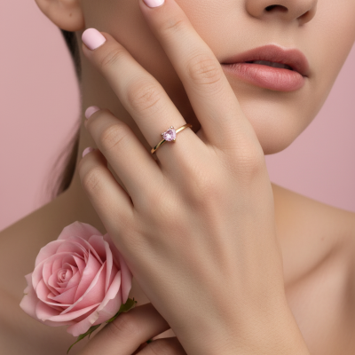 At its center, a beautifully cut pink heart-shaped stone reflects light softly, creating a charming and romantic sparkle. The slim band in 19,2K yellow gold enhances the elegance of the design, making it both refined and comfortable for everyday wear.