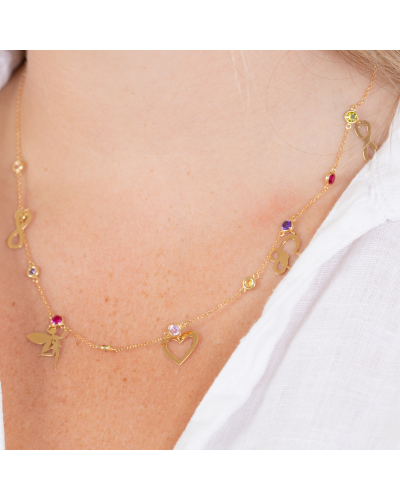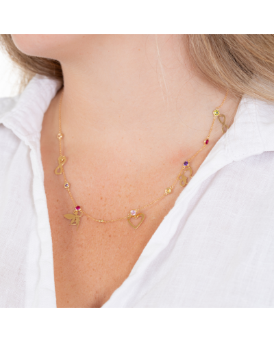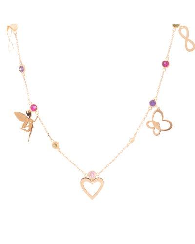 Charming 45cm necklace in 19K yellow gold, decorated with fairy motifs, hearts and small colored gemstones. A sustainable jewel full of symbolism, fantasy and elegance.