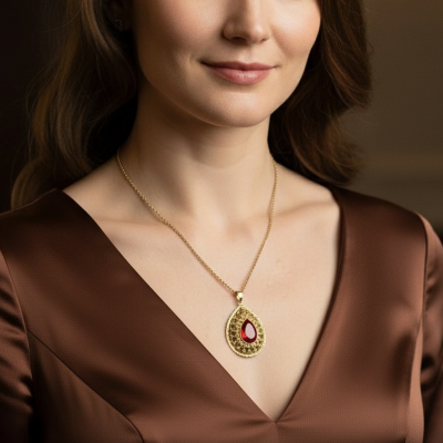 Teardrop Medallion with Red Stone in 19K Yellow Gold Filigree – Sustainable Jewel