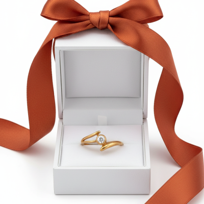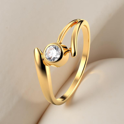 A delicate solitaire ring featuring a modern entwined design and a central zirconia stone, crafted in second-life 19K yellow gold. Sustainable elegance with timeless brilliance.