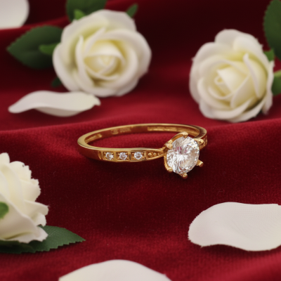 The 19K Yellow Gold Solitaire Ring with White Stone Setting, available at Lusijoia, is a timeless piece that represents elegance and meaning. The classic solitaire design highlights the central stone, while the delicate white stones set along the band add extra brilliance and a refined finish.