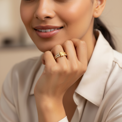 The ring is enhanced with a delicate setting of white stones, creating subtle brilliance that beautifully complements the warm gold tones and brings extra luminosity. Crafted in 19K Yellow Gold, it offers durability, premium quality and a refined finish, making it perfect for both special occasions and elegant everyday wear.