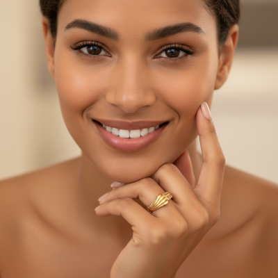 The Shell Motif Ring in 19K Yellow Gold, available at Lusijoia, stands out for its distinctive and feminine design inspired by the shape of a shell/fan, symbolizing natural elegance and timeless beauty. The sculpted central motif adds texture and sophistication to the piece.