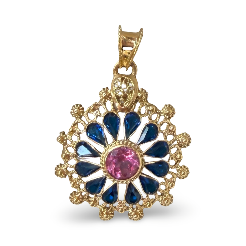 19K yellow gold pendant featuring a floral design with colorful gemstones, creating a radiant and elegant composition. A sustainable piece in excellent condition, authenticated by Lusijoia.