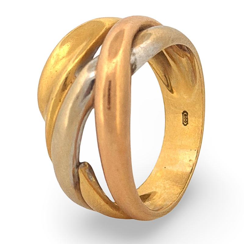 19K gold ring with an intertwined tricolor design, combining yellow, white, and rose gold tones. A sustainable piece in excellent condition, authenticated by Lusijoia.