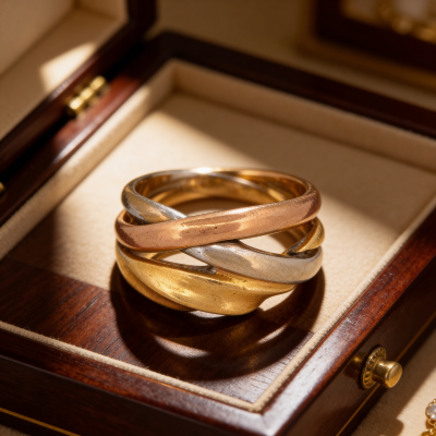 This refined 19K gold ring features an elegant intertwined tricolor design, where yellow, white, and rose gold tones blend seamlessly to create a modern and sophisticated look.