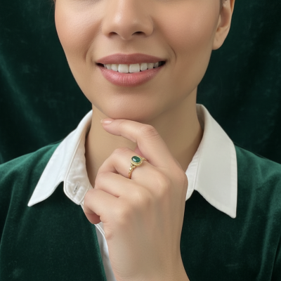 This refined 19K yellow gold ring features a natural emerald, prized for its rich green tone and its symbolism of renewal, balance, and sophistication.