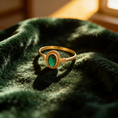 This refined 19K yellow gold ring features an emerald, admired for its deep green color and sophisticated appearance.