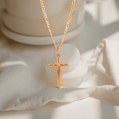 The 20mm Crucifix in 9K Yellow Gold stands out with its round canevõn design, which gives it a strong and solid appearance while maintaining refined details. Its rounded shape conveys robustness and presence, making it a remarkable jewel for both everyday wear and special occasions. Crafted in 9 karat gold, it combines durability, elegance, and symbolism, making it ideal to wear with necklaces or to offer as a meaningful gift for baptisms, communions, and other religious milestones.