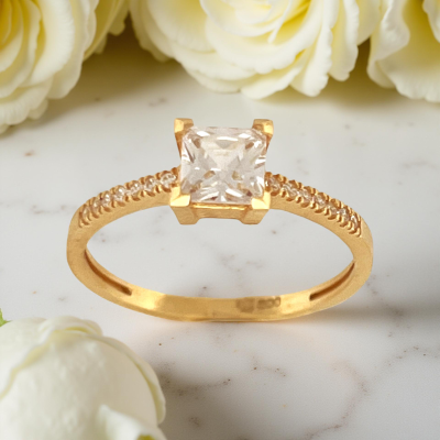 Pura elegancia en cada detalle. Este anillo solitario de la colección Eternelle presenta una brillante circonita central con corte cuadrado, acompañada de pequeñas piedras engastadas a lo largo del aro que aportan un brillo sutil y sofisticado. Elaborado en oro amarillo de 19 quilates, es la elección ideal para una propuesta de matrimonio inolvidable o para celebrar un momento especial con estilo y distinción.