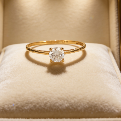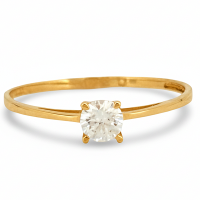 En el centro, una circonita cuidadosamente tallada refleja la luz con un brillo intenso, destacándose sobre la elegante sencillez del aro en oro amarillo 19K. Este tipo de anillo está tradicionalmente asociado a momentos importantes como declaraciones de amor, compromisos o propuestas de matrimonio.