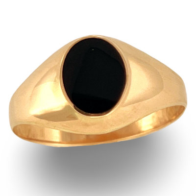 Anillo para hombre en oro de 19,2k con piedra ovalada negra con calco en oro. El borde es liso y brillante con un punzón en el exterior que garantiza la calidad del metal.