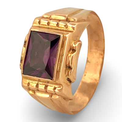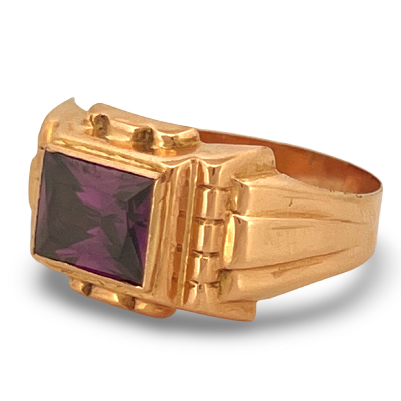 Un anillo elegante en oro amarillo de 19K con detalles artesanales alrededor de la piedra violeta tallada.