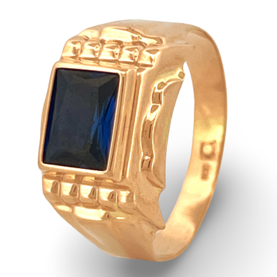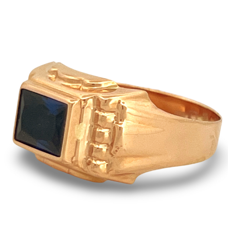 Elegancia y carácter en un anillo con piedra azul tallada, montado en oro amarillo de 19K finamente trabajado.