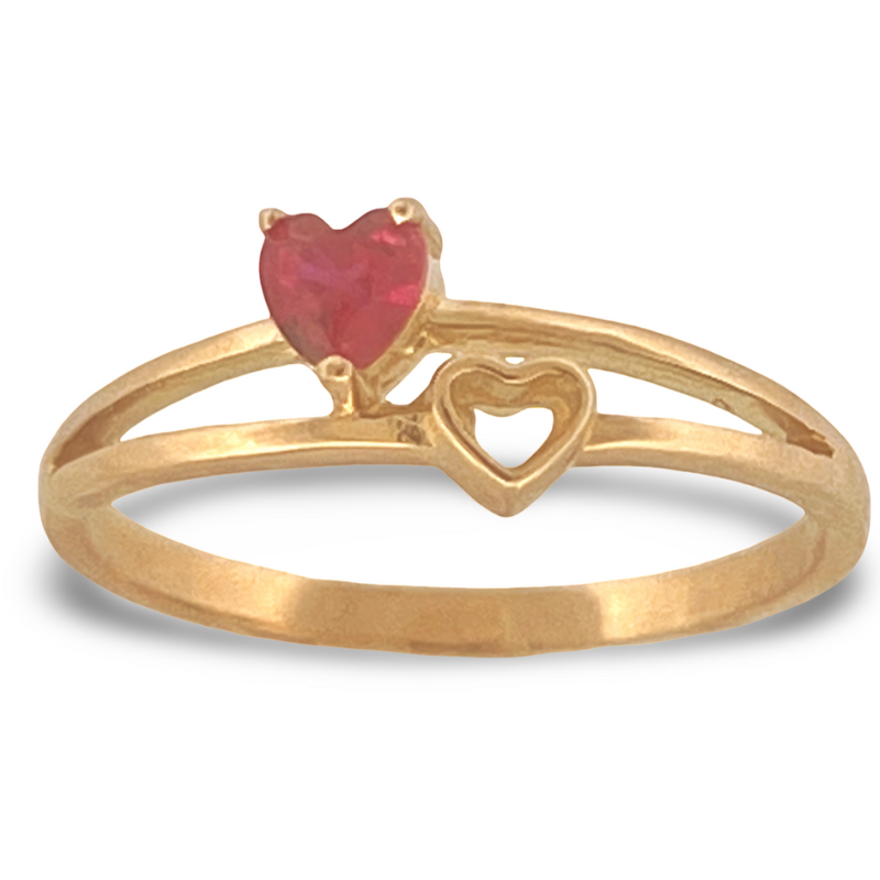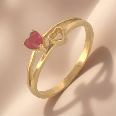 Un anillo romántico y delicado con dos corazones destacados — uno engastado con piedra rosa y otro calado, en oro amarillo de 19 quilates.