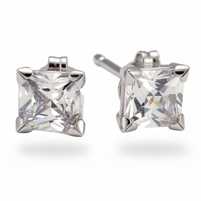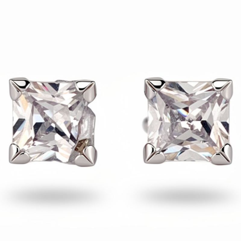 Su circonita de talla cuadrada ofrece un brillo limpio e intenso, ideal para iluminar el rostro en cualquier ocasión.