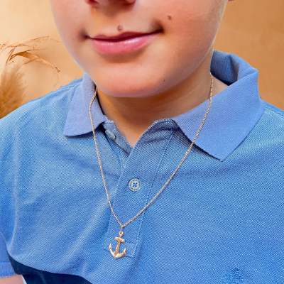 Elaborado en oro portugués 19k, un metal noble de excelencia, este colgante de 30mm presenta un acabado pulido y preciso que realza cada detalle. El diseño clásico de ancla, trabajado a la perfección, combina sofisticación y calidad superior, convirtiendo esta joya en una elección distinguida y atemporal.