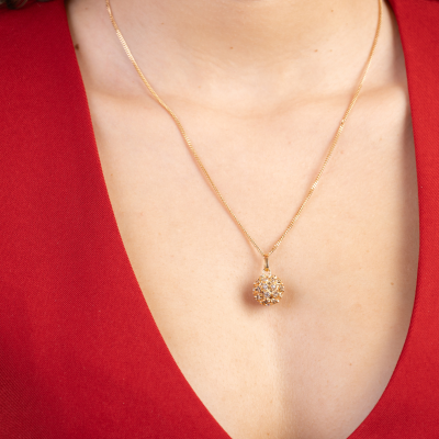 Este sofisticado colgante en oro amarillo 19k presenta un diseño esférico de 14mm adornado con delicadas piedras blancas que capturan y reflejan la luz con un brillo encantador. Inspirado en la riqueza mineral brasileña, es una pieza versátil que transmite elegancia y exclusividad, ideal para aportar un toque lujoso a cualquier look.