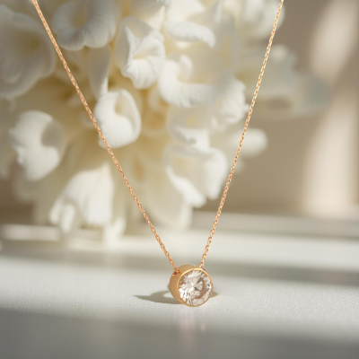Un collar delicado y sofisticado en oro 19K amarillo, con punto de luz brillante, símbolo de elegancia minimalista e ideal para novias.
