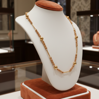 El Collar Virolinha con Esferas y Traviesas Huecas en Oro Amarillo 19K destaca por su elaboración detallada y su acabado refinado.