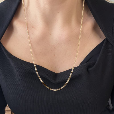 Esta cadena en oro amarillo de 19 quilates presenta el clásico diseño barbela laminada, caracterizado por su estructura fina, uniforme y ligeramente plana, que aporta un brillo sutil y sofisticado.