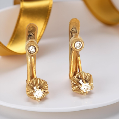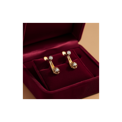Pendientes delicados y atemporales con piedras blancas brillantes y un diseño vintage en oro de 19K. Una joya revalorizada que une sofisticación e historia.