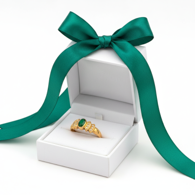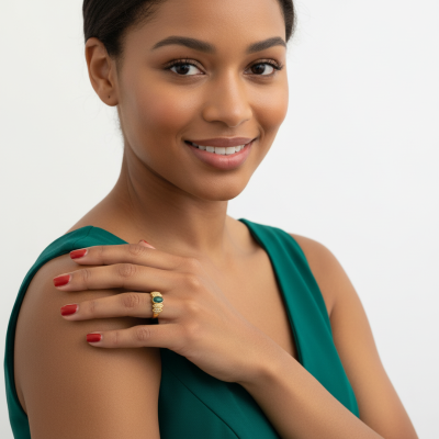 El Anillo Diseño Abanico con Piedra Verde Tipo Esmeralda en Oro Amarillo 19K, disponible en Lusijoia, es una joya de gran personalidad y valor histórico. Su diseño presenta ondulaciones en forma de abanico, realzadas por pequeñas piedras blancas, que enmarcan la piedra central verde con un brillo delicado y sofisticado.