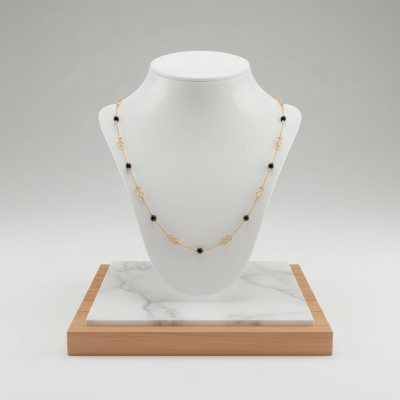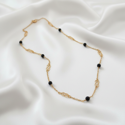 Collar delicado de 42cm en Oro Amarillo 19K con turmalinas negras intercaladas, creando un contraste elegante y moderno. Joya sostenible ideal para un estilo minimalista y sofisticado.