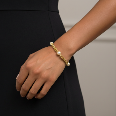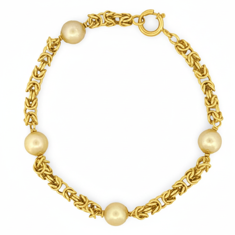 Pulsera de malla bizantina en oro amarillo 19K con perlas, una joya sostenible que une tradición, elegancia y valor atemporal.