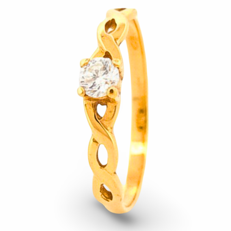Este elegante anillo en oro amarillo de 19 quilates combina la delicadeza de un diseño trenzado con la sofisticación de una piedra central tipo solitario, creando una pieza armoniosa y atemporal.