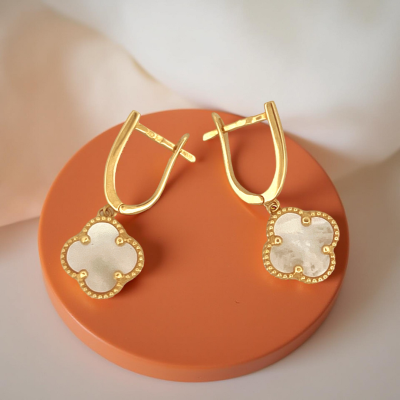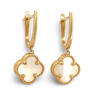 Pendientes de oro amarillo de 18K con colgante de trébol en nácar natural y cierre clic clac. Elegancia clásica y luminosa.