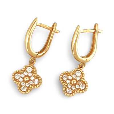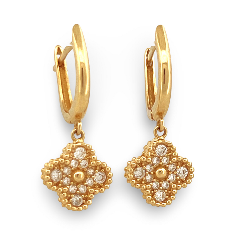 Pendientes en oro de 18K con trébol de circonitas y cierre clic clac. Un toque de elegancia y buena suerte.