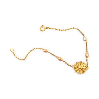 Pulsera en oro amarillo 19k con flor en filigrana portuguesa tradicional y perlas delicadas.