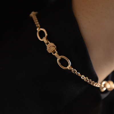 La Pulsera de Eslabones Entrelazados en Oro Amarillo 19K se distingue por su diseño único, donde los eslabones están unidos por delicados nudos, simbolizando unión, continuidad y fuerza.