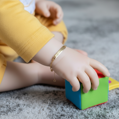 Pulsera infantil en oro amarillo de 9K, con cadena ancla, símbolo de fuerza y protección, y placa lisa ideal para grabar. Una joya clásica con un toque sentimental.