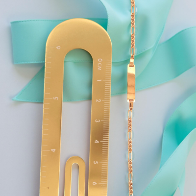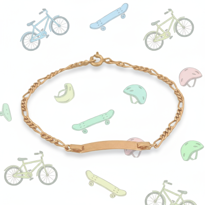 Pulsera infantil en oro amarillo de 19K con cadena 3+1, un diseño clásico y resistente. La placa personalizable permite grabar un nombre o una fecha, convirtiéndola en una joya única y significativa.