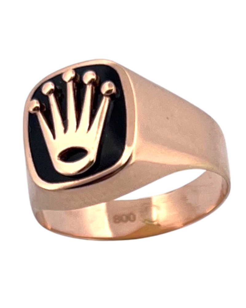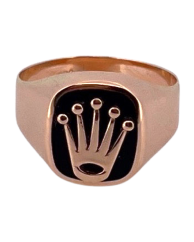 Um anel imponente com coroa de cinco pontas em destaque sobre fundo preto esmaltado — símbolo de poder, estilo e sofisticação atemporal.