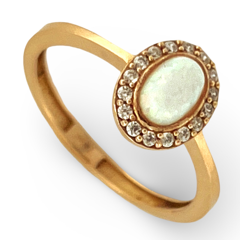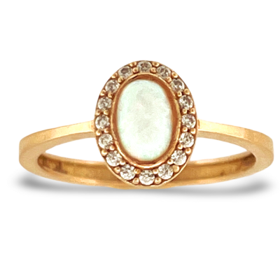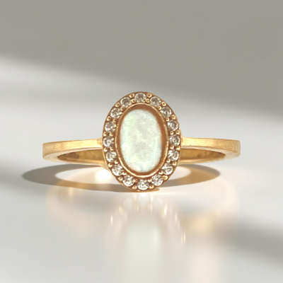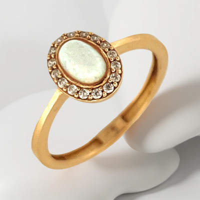 Um anel encantador em ouro 19K amarelo com madrepérola oval central e contorno de zircônias, que reflete delicadeza e brilho natural.