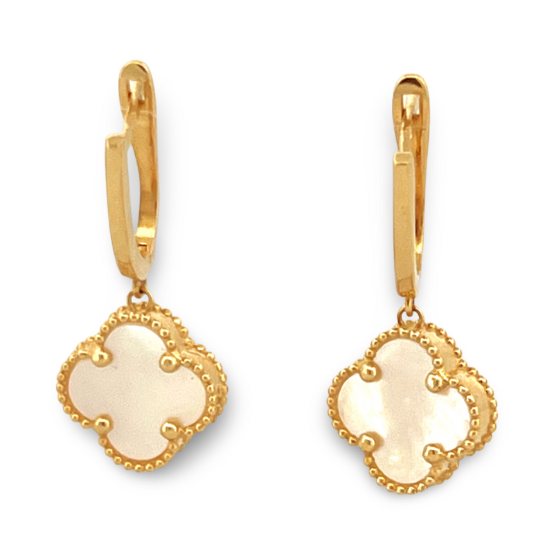 Brincos de ouro 18K com pendente em formato de trevo de madrepérola e fecho clic clac. Elegância clássica com um toque de luz.