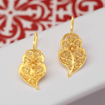 Brincos elegantes com Corações de Viana de 22 mm em ouro 19K amarelo, trabalhados com filigrana artesanal. Uma joia que simboliza amor, fé e tradição.