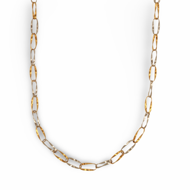 Gargantilha bicolor com elos martelados em ouro 19K, peça de segunda vida que combina textura artesanal, brilho único e elegância intemporal.