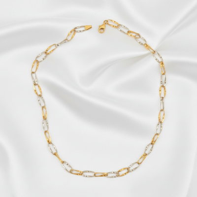 A Gargantilha Elos Martelados 40cm em Ouro 19K Bicolor destaca-se pela combinação perfeita entre ouro amarelo e ouro branco, criando um contraste moderno e sofisticado. Os seus elos apresentam um acabamento martelado, que confere textura, profundidade e um brilho especial sob a luz.