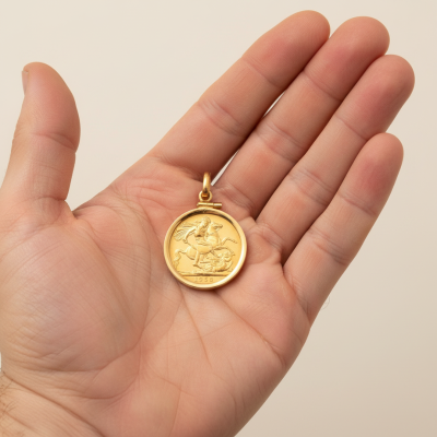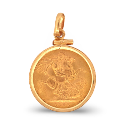 Medalha em ouro com moeda Libra (Elizabeth II) em Ouro 22K, símbolo histórico da tradição britânica. Peça exclusiva com valor patrimonial e excelente opção de ouro de investimento.